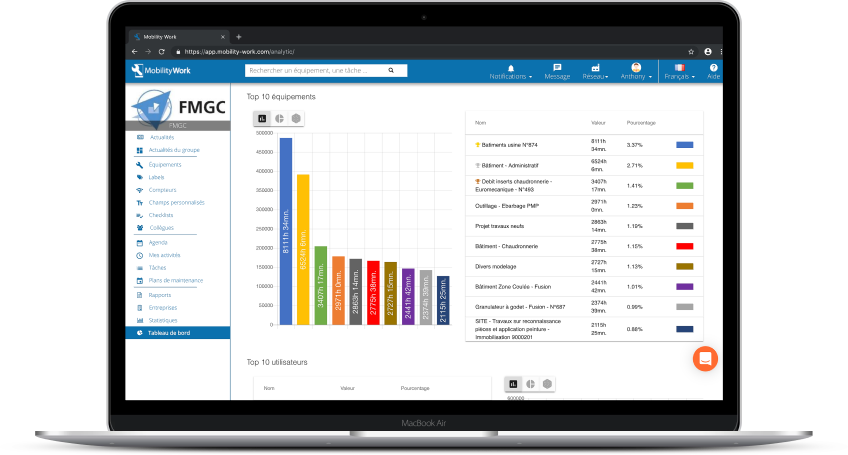 Grâce à Mobility Work, vous pouvez adapter votre stratégie de maintenance industrielle en fonction de vos besoins. La solution est en effet équipée d’un outil d’analytique, grâce auquel vous retrouvez toutes vos données de maintenance compilées dans des graphiques et tableaux pour pouvoir les analyser. Grâce à l’outil, vous pouvez voir les utilisateurs les plus actifs de votre réseau, visualiser les équipements qui ont demandé le plus d’heures d’intervention, vérifier quels labels ont été les plus utilisés… Vos données sont ainsi classées pour vous permettre de mettre en place une stratégie de maintenance prédictive, ou prévisionnelle, en fonction des résultats observés.